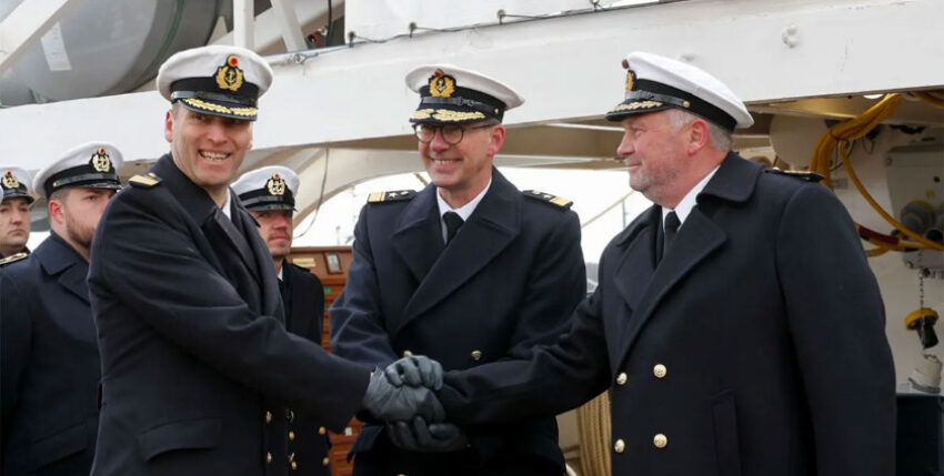 Es ist ungewöhnlich, was Kapitän zur See Nils Brandt – unser Mann des Jahres 2021 im Marineform – für die Deutsche Marine geleistet hat. Die Tatsache, das nicht nur der Marine, sondern der Bundesrepublik Deutschland dieses wichtige und repräsentative Schiff erhalten geblieben ist, ist für immer auch mit seinem Namen verbunden. In seiner Abschiedsrede, die er sich vom kalten in den Rahen lärmendem Ostwind nicht übertönen ließ, dankte er vor allem der Besatzung, die er die „zweite Erstbesatzung nannte“ und den anwesenden Gästen für Ihre Unterstützung und Loyalität. Und davon gab es reichlich, denn es waren Vertreter der Stadt Kiel und des Kieler Landtages vertreten, allen voran die Landtagsvizepräsidentin Aminata Touré. Vertreten durch hochrangige Repräsentanten waren die Flottillen, Schulen und das Marinekommando, der Deutsche Bundeswehrverband, ehemalige Kommandanten, der Freundeskreis und natürlich auch die Familie Brandt, bei der sich der scheidende Kommandant besonders bedankte.