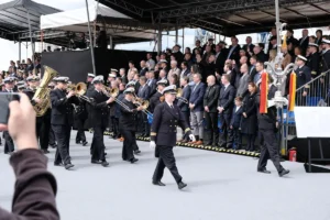 The city of Augsburg, represented by the Third Mayor Bernd Kränzle, emphasised the close connection between society and the navy with its sponsorship. The mayor made reference to the date 8 May and proudly explained that Augsburg, the city of peace, was currently celebrating its peace festival. The commissioning of a new corvette was very fitting. He concluded his speech with the words "God bless Augsburg". Rear Admiral Christoph Joachim Müller-Meinhard emphasised the importance of the completion of the new corvettes for the security of the country. He himself also found personal words, as he had also once sailed on the "Augsburg" of frigate class 122. Flotilla Admiral Andreas Czerwinski from the BAAINBw recalled the traditions of the old "Augsburg", which was also known as the "Wild 13" due to its hull number 213. He was referring to the eponymous characters from the Augsburg puppet theatre. Was that a coincidence? Perhaps. The old Augsburg also had thirteen commanders when she was decommissioned in 2019.