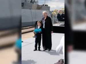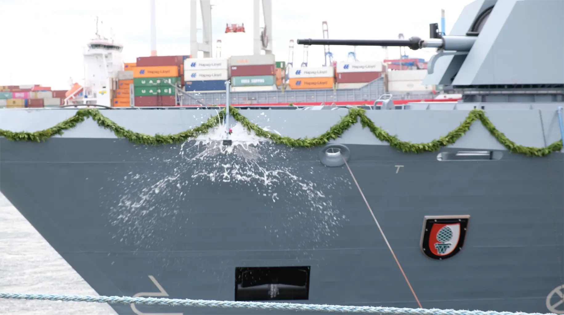 On 8 May 2025, the fourth corvette of the second batch of Class 130 was officially christened "Augsburg" at the Blohm+Voss shipyard in Hamburg. The festive ceremony took place in the presence of numerous representatives from politics, the Bundeswehr and industry. The godmother was Sigrun Maxzin-Weigel, Director of the Evangelical Children's and Youth Welfare Centre in Augsburg. She broke the christening bottle on the bow of the 89 metre long unit with the traditional cutting of the line. Later at the reception, she explained how close her personal ties to the naval units with the "Augsburg" had been - she had a picture of the second "Augsburg" - a class 120 frigate - in her office.