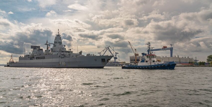 Was geht im Marinearsenal Warnowwerft Rostock? Steht man früh auf, sieht man was passiert. Kurz nach einem morgendlichen Regenschauer, schiebt sich der Bug der Fregatte „Hessen“ durch die Molenköpfe und wird von zwei Schleppern zum Liegeplatz im neuen Marinearsenal geleitet. Dem X- Beitrag des Bundesamtes für Ausrüstungs, Information und Nutzung der Bundeswehr (BAAINBw) zur Folge, wird auf der „Hessen“ eine Sofortinstandsetzung durchgeführt. Nach erfolgreicher Durchführung verließ das Flaggschiff der VJTF am frühen Nachmittag das Marinearsenal, um sich dem Verband wieder anzuschließen.