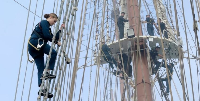An Bord wird sie kräftig mit anpacken müssen. Die junge Frau bewies aber bereits vor dem Ablegen in Cádiz Mut und körperliche Fitness, als sie mit Sicherungsleine die Takelage eines fast 50 Meter hohen Mastes problemlos hinaufkletterte.