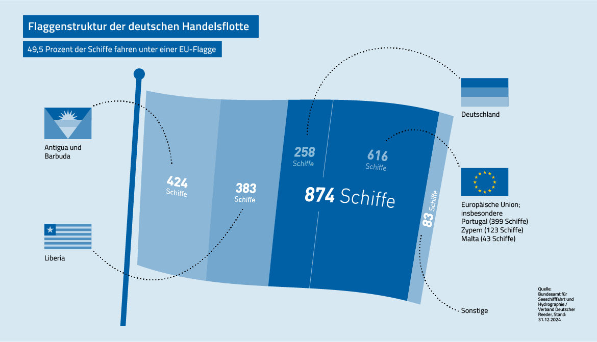 Auf der Internetseite des VDR ist unter Daten und Fakten nachzulesen, dass die deutsche Reedereibranche trotz des Branchenriesens Hapag-Lloyd mittelständisch geprägt ist: Mehr als 80 Prozent der Unternehmen besitzen weniger als zehn Schiffe. So gibt es in Deutschland fast 290 Reedereien mit 1764 Schiffen, das ist weltweit gesehen Platz sieben. Aber nur 49,5 % der Schiffe in deutschem Besitz fahren unter einer europäischen Flagge; und von diesen 874 Schiffen werden nur 258 unter deutscher Flagge geführt. Das heißt, mehr als die Hälfte der deutschen Schiffe - es sind 890 - wurden aus der EU ausgeflaggt, im Wesentlichen nach Liberia (383) und Antigua und Barbuda (424). Dabei ist das Einflaggen ins nationale Schiffsregister der Deutschen Flagge immer noch der beste Schutz.